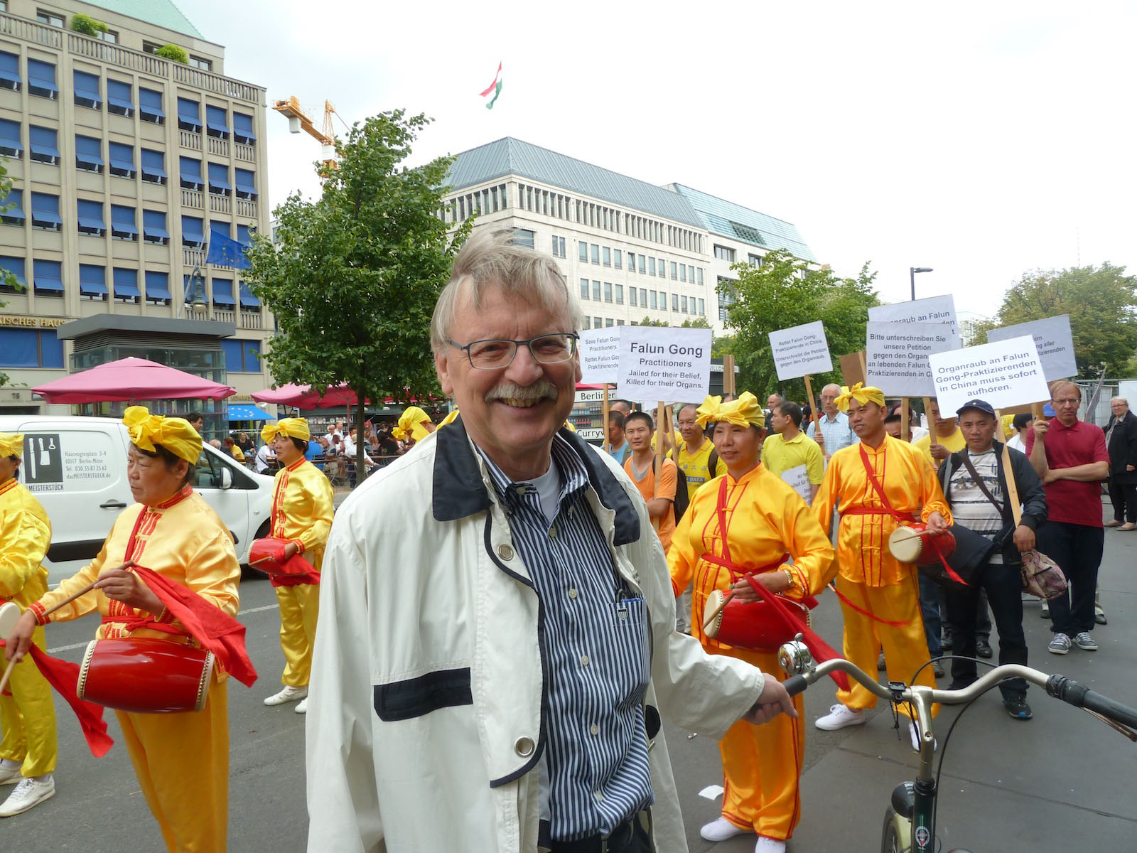 当游行队伍快接近布兰登堡门时,一位骑车过来的老先生下车观看了很久。他是舒斯特(Schuster)医生,专门治疗心脏疾病,他表示,之前就已从报纸上看到有关中共活摘器官的报道。作为医生,他认为,活摘器官的现象完全有可能在中国发生。