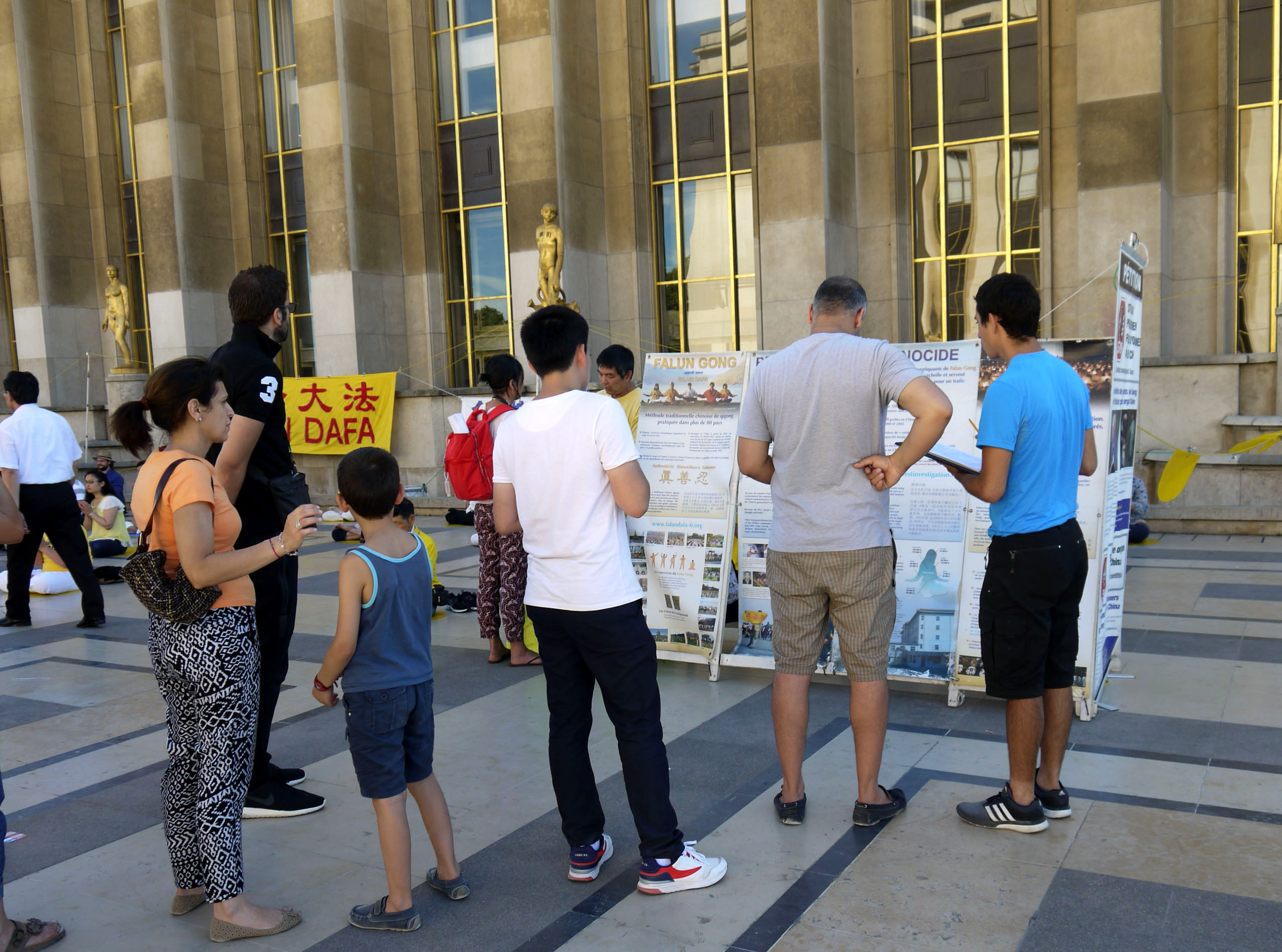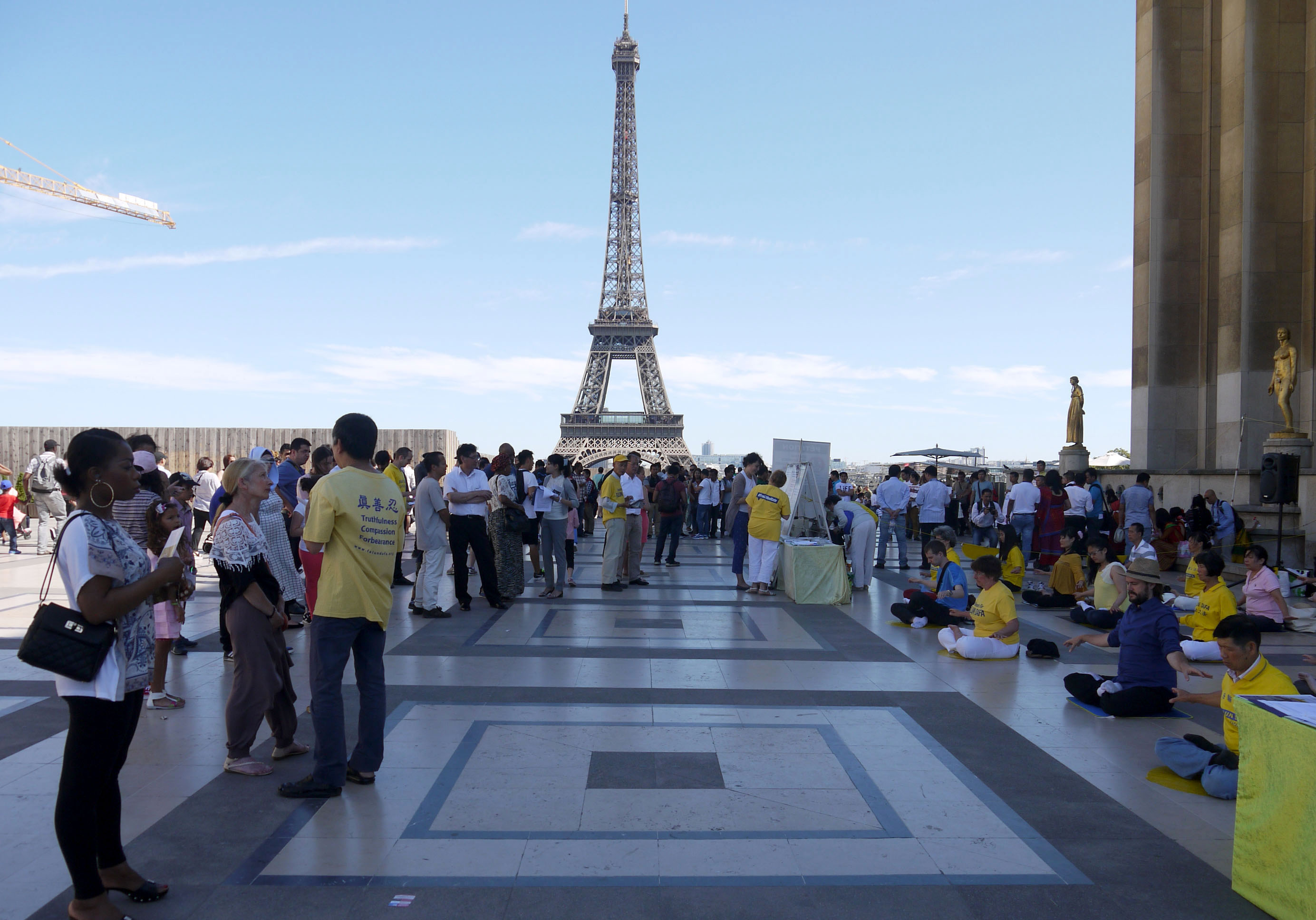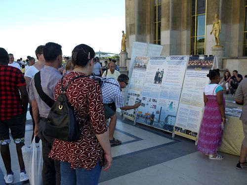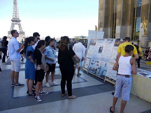 ![]() 图1-5:二零一六年八月七日星期日下午,法国法轮功学员在巴黎人权广场传播法轮功的真相,许多游客驻足了解。 |
