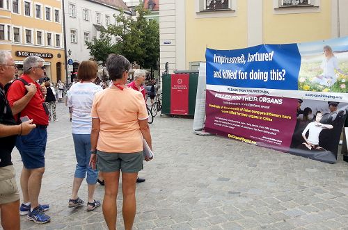 当天有很多德国民众在征签表上签名,其中有一位在雷根斯堡大学就读的德国女大学生Christina,她表示自己是学法律的,下学期她们正好有一门课是关于人权迫害的,而且中共在中国对于人权的迫害会是课程的一个重点。她说她在之前就了解过法轮功学员被迫害的相关信息,也看过德国电视台3Sat播放的有关活摘的纪录片《预定器官:杀戮》,她询问是否可以把这个节目在大学里进行播放,她想要把这个当作课题重点,给同学们做相关介绍。她与学员谈了很长时间,了解了更多信息,并留下联系方式,想要在大学里做更多的介绍,她认为应该让更多人了解事实真相。