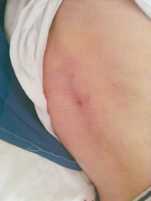![]() 被非法关押后的姜德亭 | ![]() 姜德亭的后背有伤 |