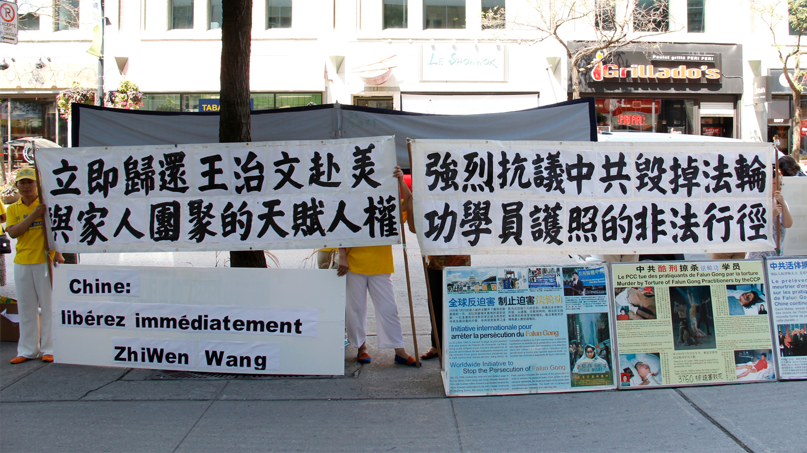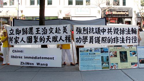 ![]() 蒙特利尔部分法轮功学员来到蒙特利尔中领馆前集会,抗议和谴责中共当局阻挠法轮功学员王治文前往美国与女儿、女婿团聚 |