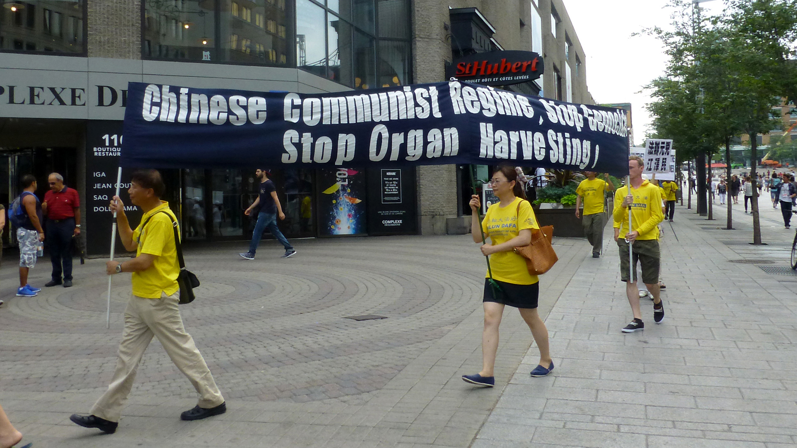 最后参加集会的法轮功学员手举展板与横幅,穿过蒙特利尔最繁华的圣凯瑟琳大街与唐人街,向民众传递真相。