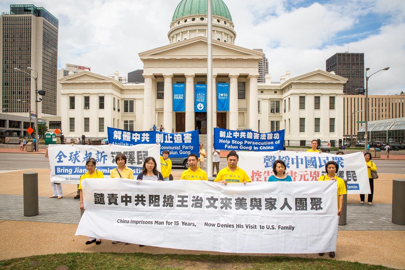 2016年8月13日,美国密苏里州圣路易市的法轮功学员来到市中心最著名的景点老法院(Old Court House)和拱门公园(The Arch),抗议江泽民、曾庆红等迫害法轮功的元凶阻挠王治文父女团聚。
