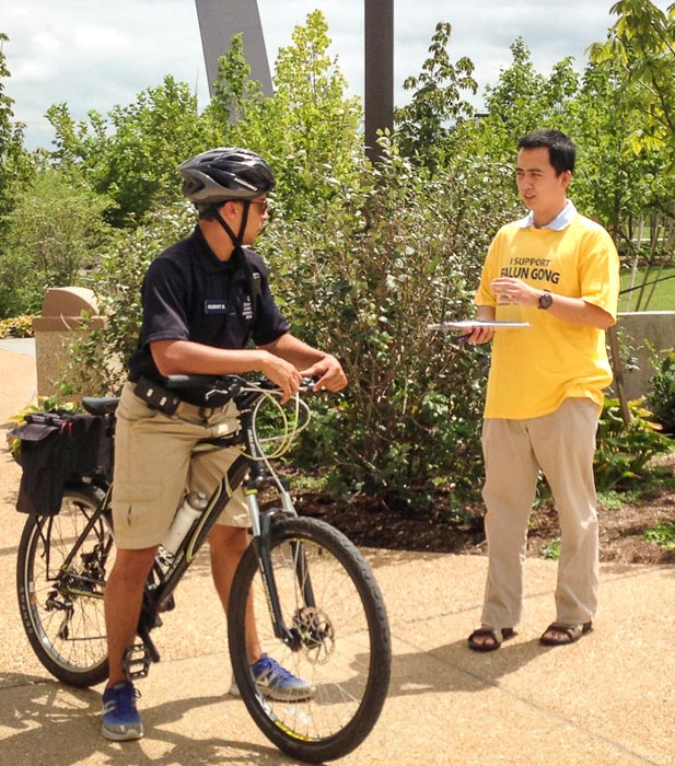 抗议活动当天,圣路易市中心的游客非常多,许多人都拍下了活动的场面,也有很多人在征签表上签名,支持反迫害。