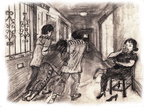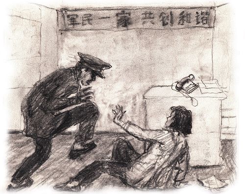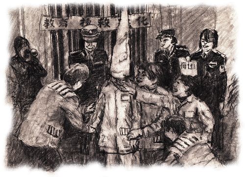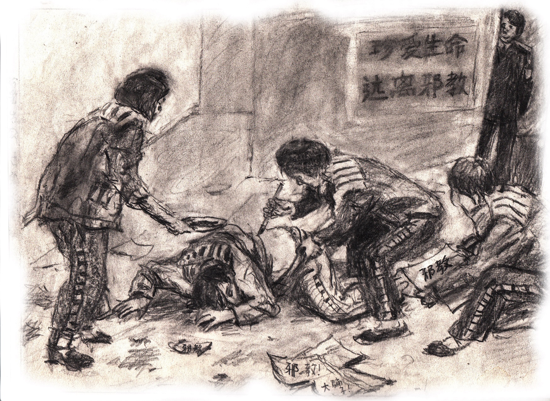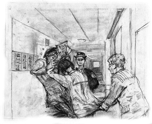 七、一次,我被带到一层空闲的楼上,狱警把监控器掰下,开始对我进行封闭式“攻坚”。我刚一进房间,犯人就一拥而上,把我摔倒在一块床板上。狱警指挥犯人在我的后背写污蔑大法的字,往我的内裤里塞污蔑大法的纸条。