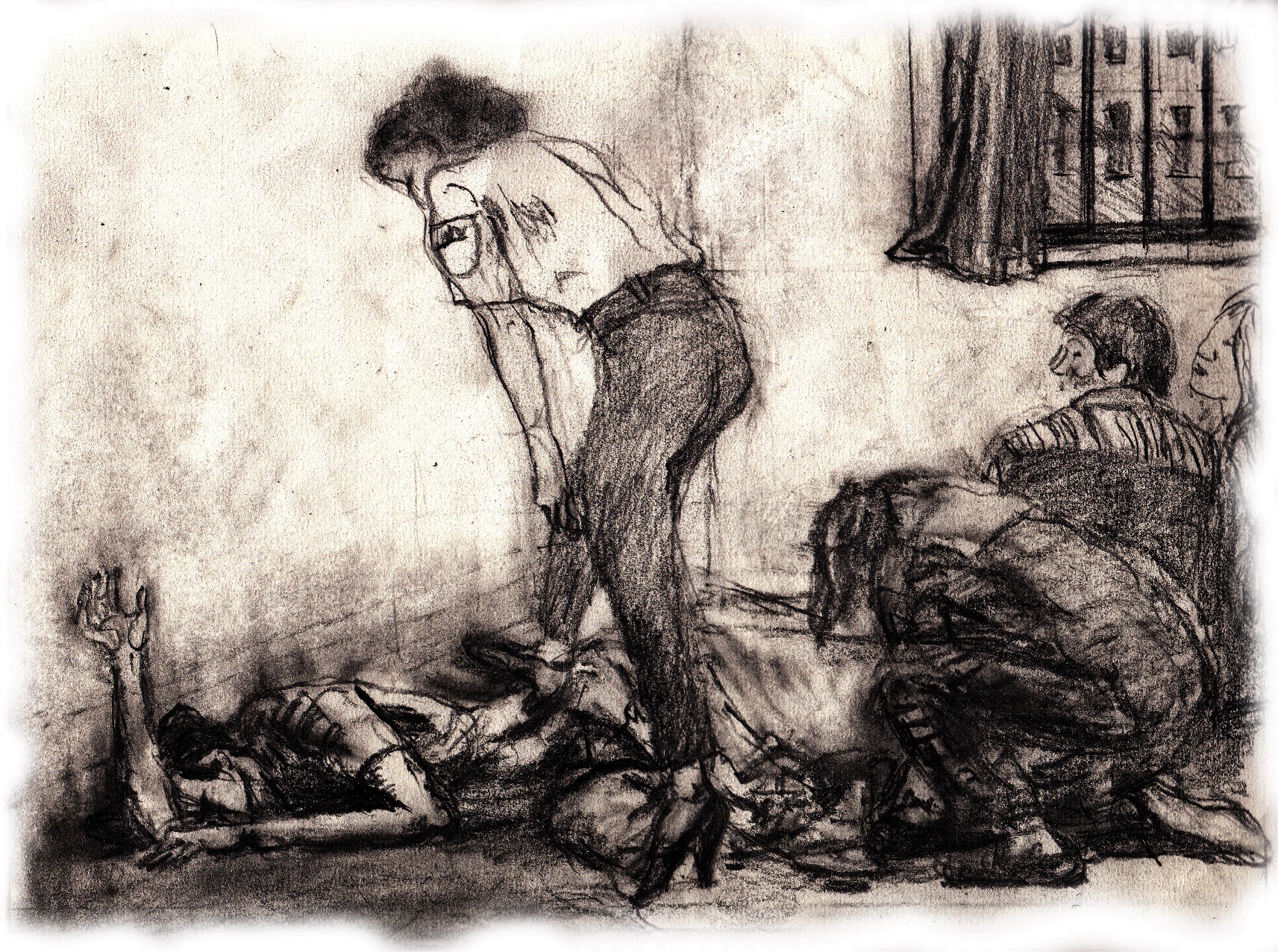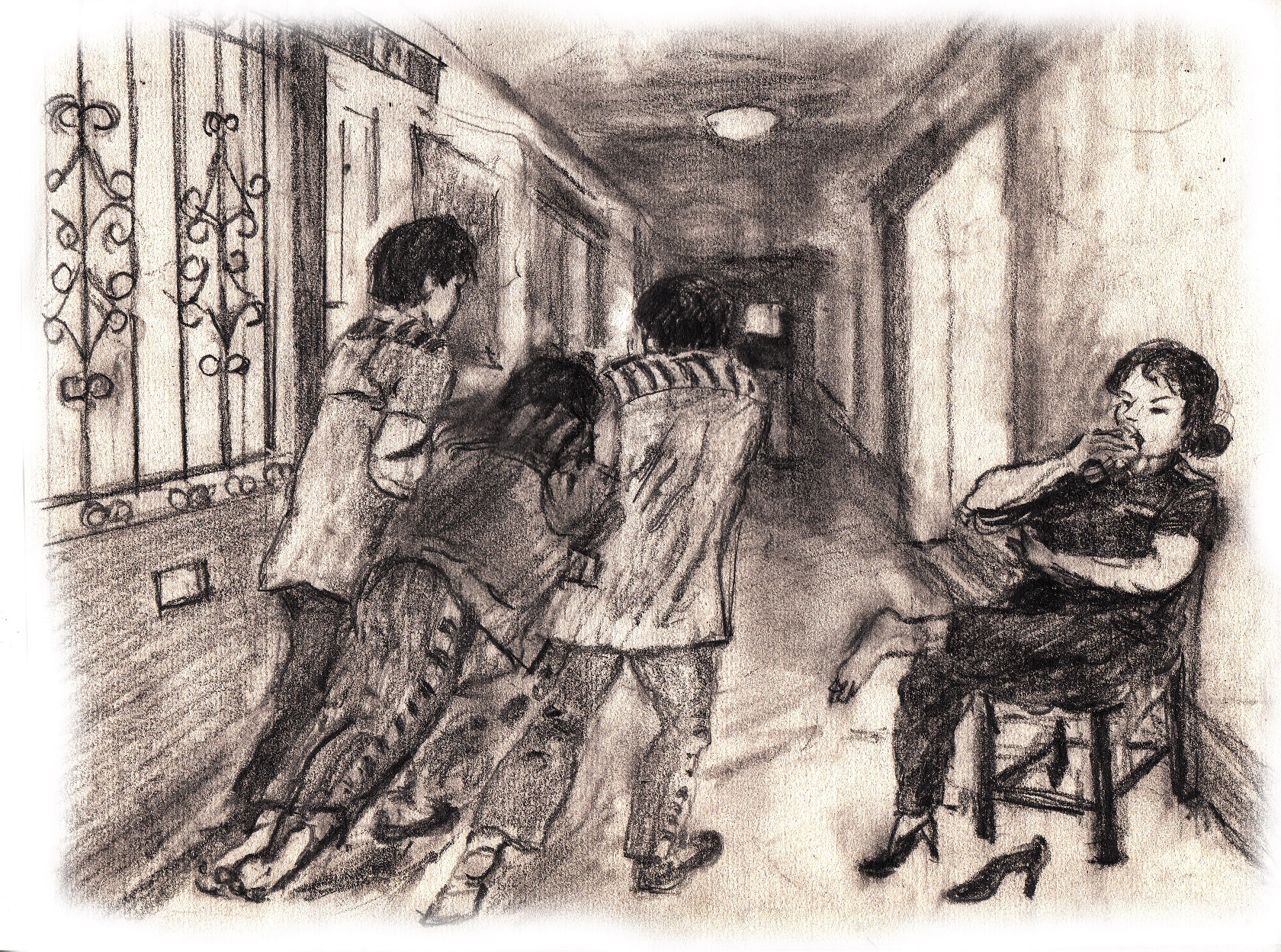 十、我被罚站,两个犯人一边给警察织毛衣,一边监控我,我的腿、脚、和手都肿得像馒头一样,一按一个坑,四十几号的鞋子我都穿不进去,右腿没知觉了。我昏倒在地,醒来接着站,我站了十四天,精神恍惚,神智不清,没有了方向感,一下又摔倒在地,太阳穴摔了一个大包,血液渗透进眼睛,两只眼睛变成了熊猫状。