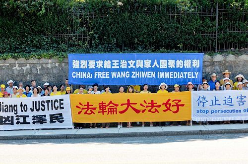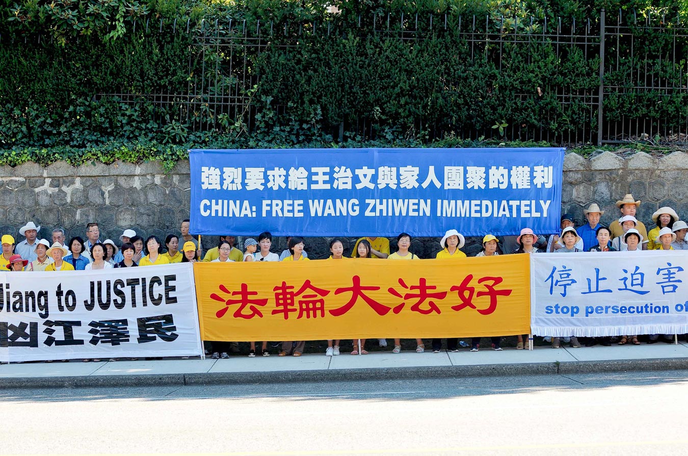 温哥华法轮功学员在中领馆前打出“强烈要求给予王治文与家人团聚的权利”、“法轮大法好”、“停止迫害法轮功”、“法办元凶江泽民”等横幅,过往的车辆不时鸣笛表示支持。