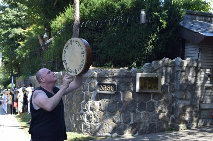 温哥华著名博主Dennis Watson先生也闻讯前来加入温哥华法轮功学员的抗议活动,Dennis Watson先生在中领馆大门前,手执原住民的鼓,对着中领馆不断地打鼓表达抗议。他表示,“我认为现在每个人都知道在中国对法轮功的迫害,我的心都碎了。”