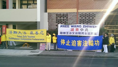 图1-3:悉尼法轮功学员在中共总领事馆前和平请愿,抗议中共犯罪集团阻挠王治文赴美与女团聚。 |