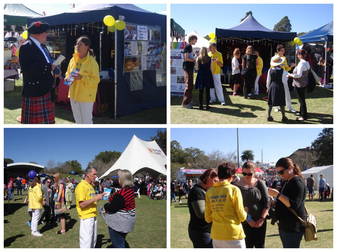 法轮功学员在展位上展开了法轮大法好的横幅,并摆放了介绍法轮功的真相资料,许多民众前来咨询,听学员介绍法轮大法的美好及中共迫害法轮功的真相,并表示要到相关网站更多地了解法轮功。还有不少人询问当地炼功点的信息,表示想学炼法轮功。