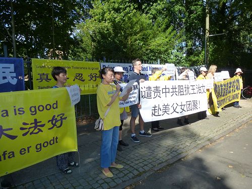 ![]() 丹麦法轮功学员在中使馆前抗议中共阻挠王治文赴美与家人团聚。 |