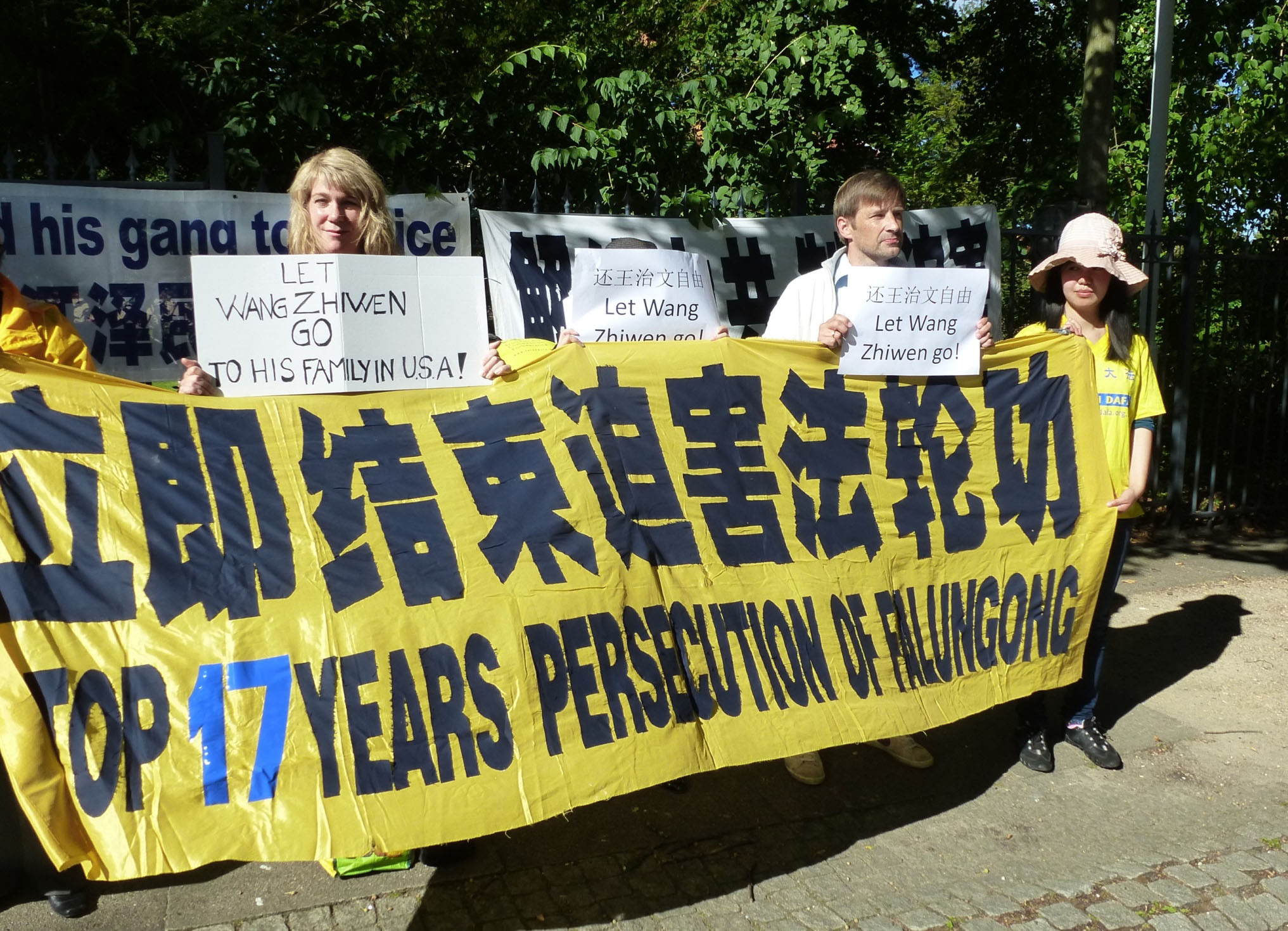 吉斯拉(Gisela)女士是一位瑞典籍的法轮功学员。她今天举着自己专门做的、上面写着“让王治文回到他在美国的家人身边!”的标语来到抗议现场。她说:“自从一九九九年迫害开始,王治文就被非法关押迫害,失去了自由。我本人就是在一九九九年开始修炼法轮功的。在这十七年里,我一直在尽我的最大努力,去了全世界的许多国家,呼吁停止在中国对法轮功的迫害。我认为王治文不应该再继续受迫害了!所有的法轮功学员都不应该再受迫害了。”