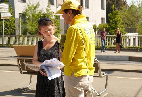 米里亚姆(Mirjam)带着两个孩子路过,她看过王治文的经历以及中共迫害法轮功学员的照片后谈到:“太可怕了,在(中国)发生的这一切,我对此一无所知,实在是太严重了。我要了解更多的相关讯息。”在学员的告诉她中共活摘法轮功学员器官的罪行后,她特意拍下了影片“活摘”的介绍,打算去观看:“人们应该了解正在发生什么,这非常重要。我会了解更多的讯息,或许我可以提供些帮助,或者让更多人知道。”