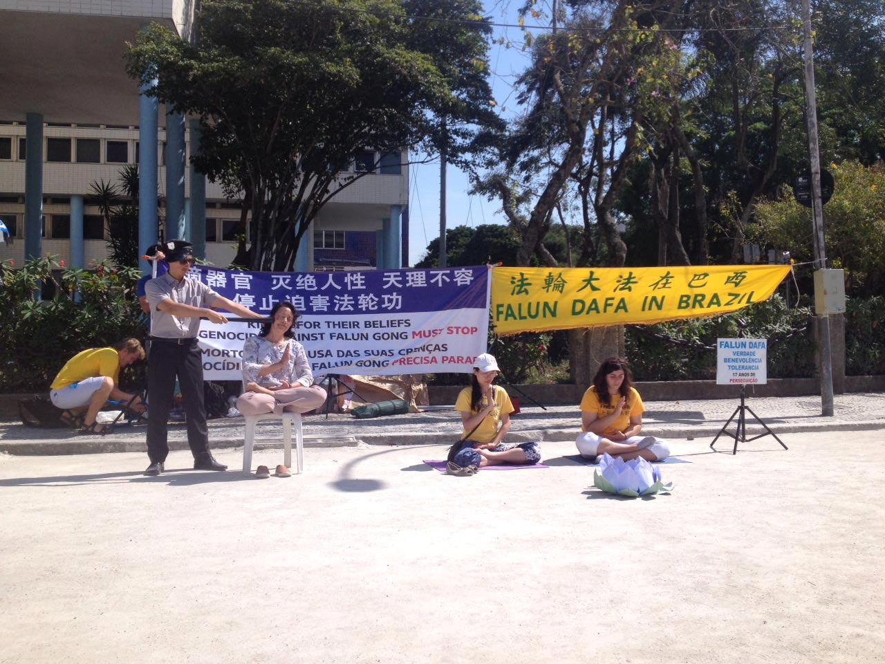 学员们还来到Arpoador海滩景点,学员们拉起横幅、摆上展板,炼功、发资料按部就班。当酷刑展开始后,一个小姑娘跑到演警察的学员旁对他说:“不要打她,不要打她。”当她得知这是表演时,她还是疑惑地看着“警察”。她还跟着法轮功学员一起学炼了功法动作。