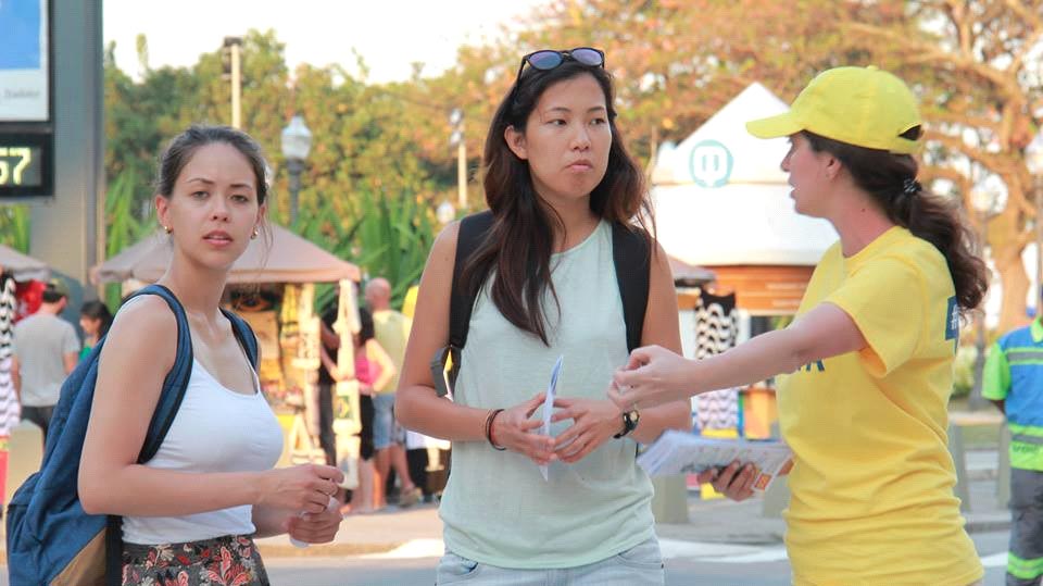 花白头发的律师挨迪松(Edson Modesto),拿着报纸在闲逛,学员走上前递给他真相资料,他站住看起来,看完法轮大法简介他表情肃敬,当读到法轮大法弘传世界一百多个国家和地区时,他微微地点头,当他看到中共迫害及活摘学员器官时。他停在那里些许时间,之后快速从衣袋里拿出笔和名片,签上名字递上名片,坚定地说:“如有需要打电话给我。”