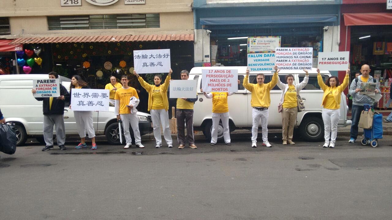 ![]() 图5:在圣保罗25街的活动,法轮功学员打着横幅,举着展板,呼吁中共停止迫害法轮功 |