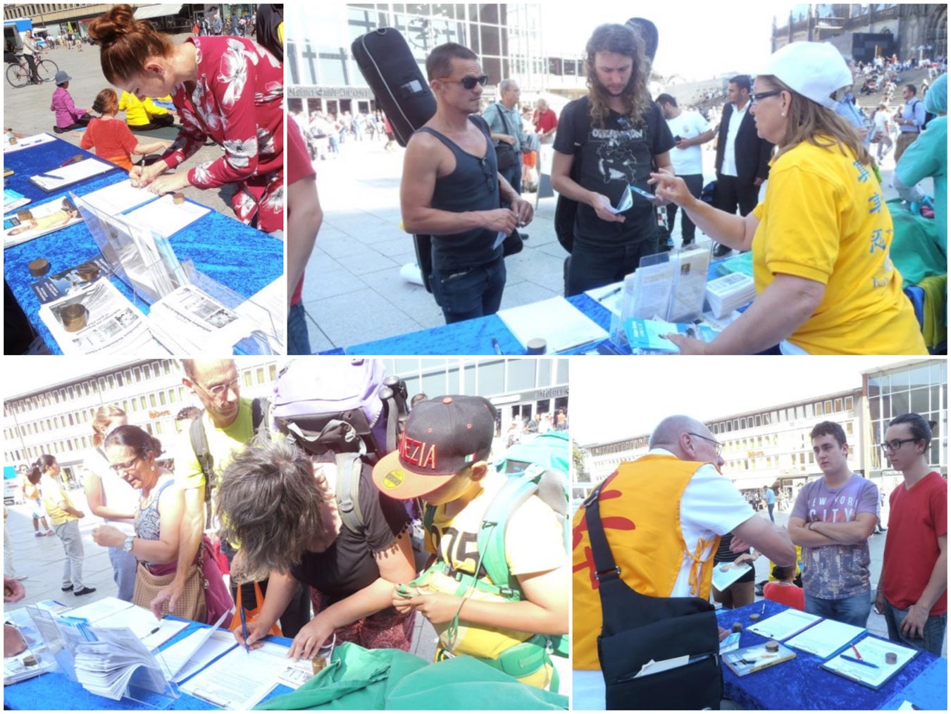 八月正是旅游旺季,又是学生暑假期,来自德国境内境外的游客拥拥挤挤的。几乎每个星期六都会来几大巴的大陆中国游客,也有很多来参观科隆大教堂的中国留学生。值此之际,来自科隆当地的以及北威州其它城市的几十名法轮功学员,向更多的民众讲迫害真相。