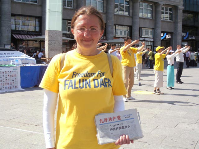 一位身着黄色大法T恤衫,总是面带微笑,见到中国游客就用中文说“法轮大法好”并递上《·九·评*》的西人学员,她叫拉丽萨·堪佩尔特,她是俄罗斯裔法轮功学员,在德国生活二十多年了,是汽车绘图技术员,于五年前幸得大法。