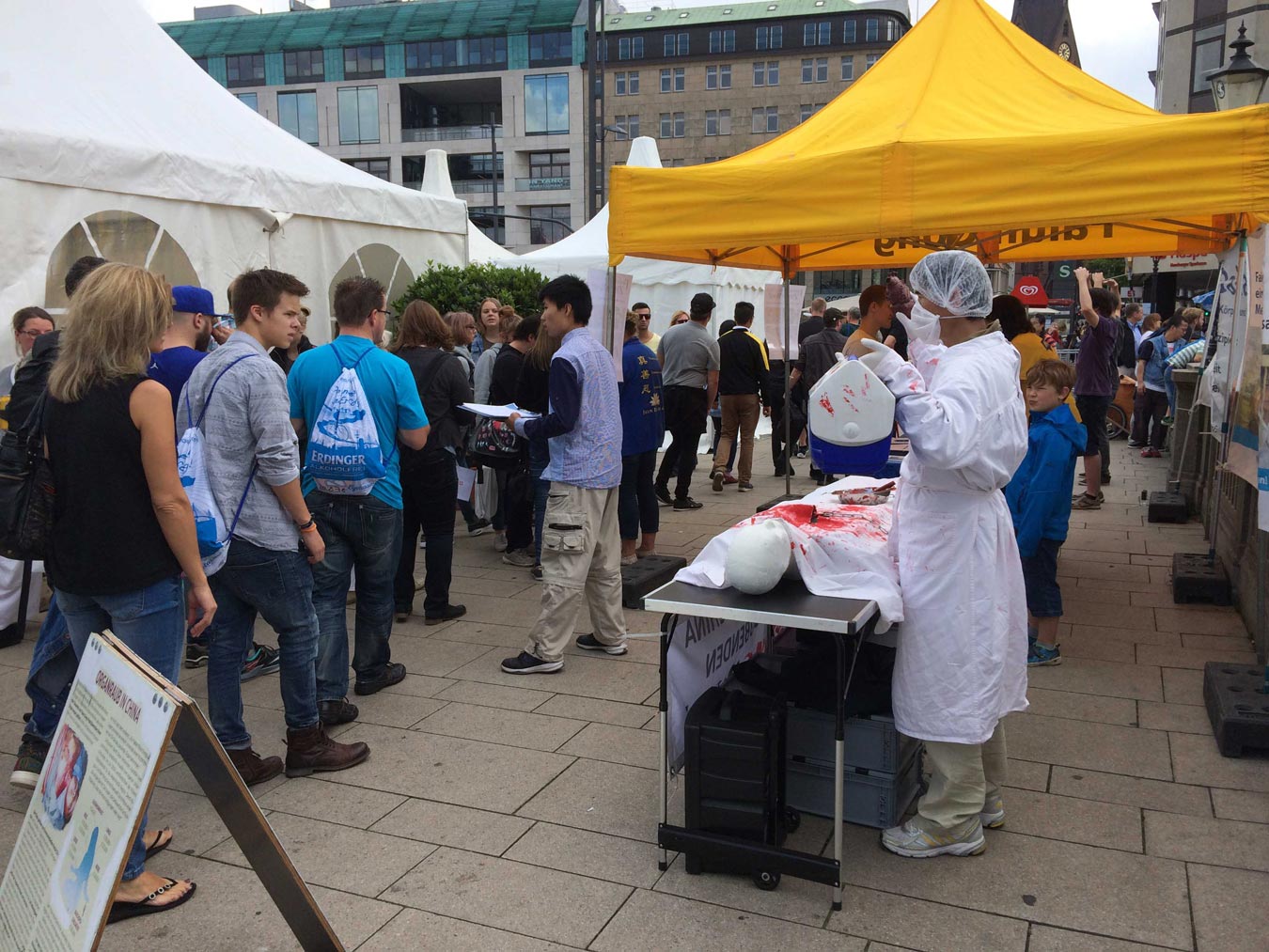 【明慧网二零一六年八月二十二日】二零一六年八月二十日星期六中午,汉堡法轮功学员在市中心举办信息日活动,用展示法轮大法的五套功法,和模拟中共活摘法轮功学员器官手术台的方式,来揭露法轮功被中共迫害的真相。