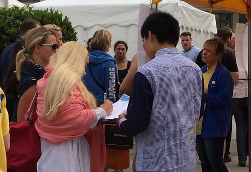 有行人看到模拟手术台、读到展板上的说明文字后,马上站下来签字。也有步行街管理人员在学员展示第二套功法时,羡慕地说:“这几个年轻人看上去真是非常的放松。”学员向这位女士解释了法轮功的第二套功法,并告诉她在国内这样炼功就会被抓,甚至被活摘器官的危险。这位女士立即在反对迫害的征签表上签了字声援法轮功学员反迫害。她被法轮功学员真心投入告诉人们真相而感动,说:“你们在这里做的事情非常重要。”