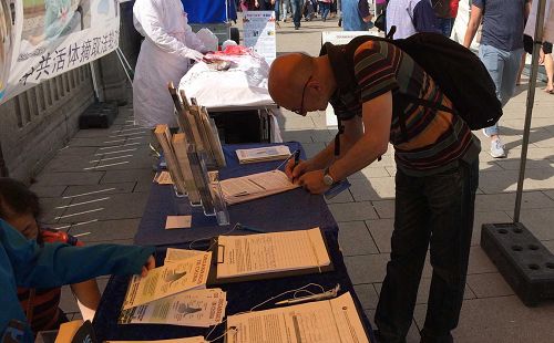 一个年轻人走上前来和学员交谈,他因为工作去过中国不同城市,对于中国现状感到非常悲哀,说在那里看不到真实情况。因为所有的媒体都被中共控制。他在征签表上签了名,又指了指法轮功学员被迫害的图片说:“(看到这些)还用得着多说什么吗?”
