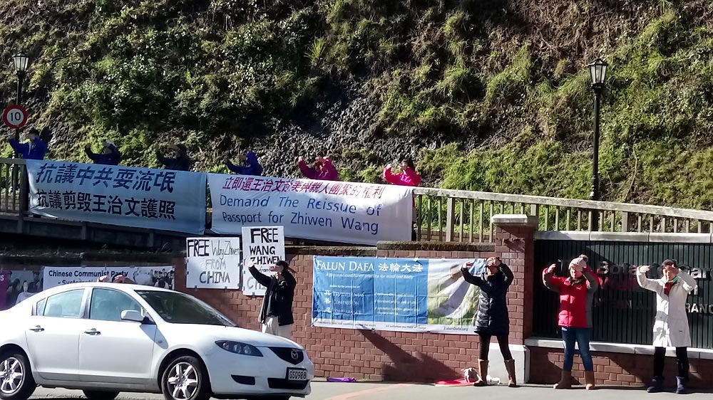 新西兰首都惠灵顿学员来到中国大使馆前,抗议中共阻挠法轮功学员王治文赴美与女儿团聚