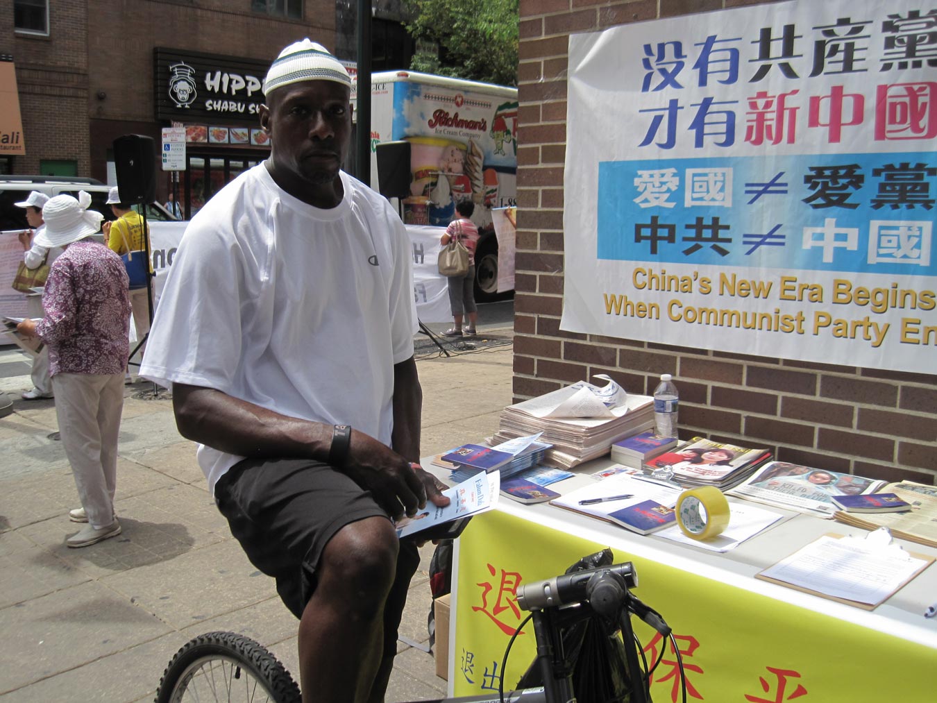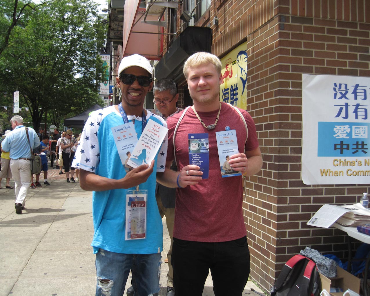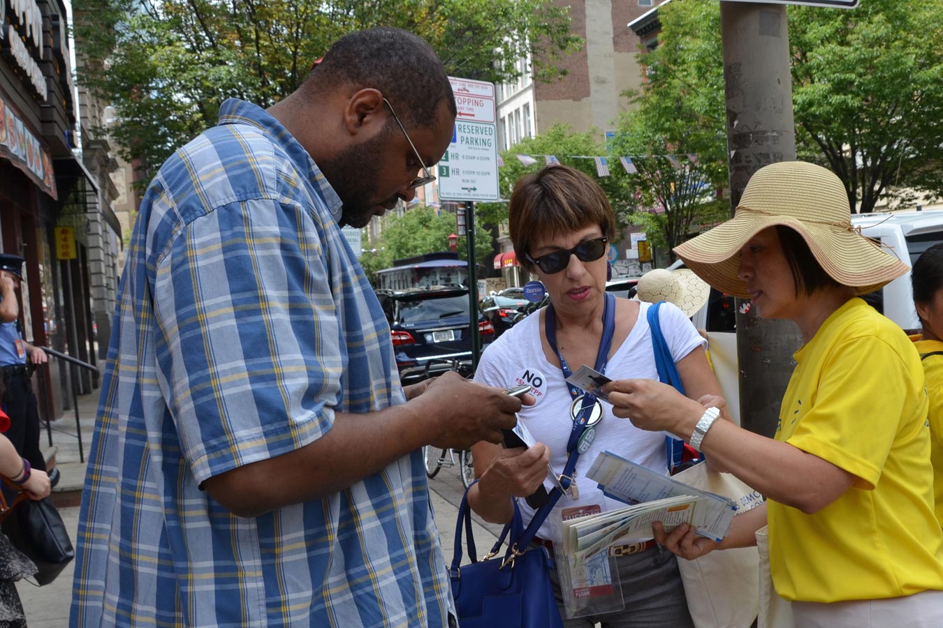 费城居民Tajodore Lacey先生路过中国城时,停下来聆听法轮功学员讲真相,他表示对活摘器官这样的罪行感到非常震惊,并在征签表上签名。Lacey先生说:“不管哪个国家的人,都无法接受这样的现实,一个人的身体器官被分割后买卖,而受害者完全是被迫的,这简直不是人的行为。”