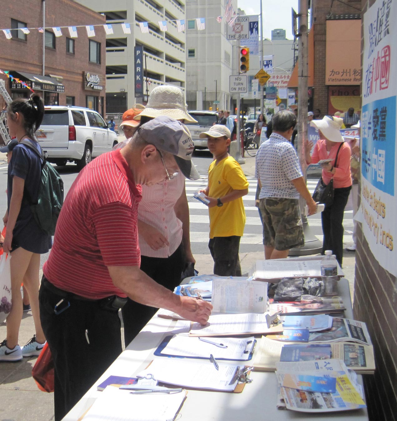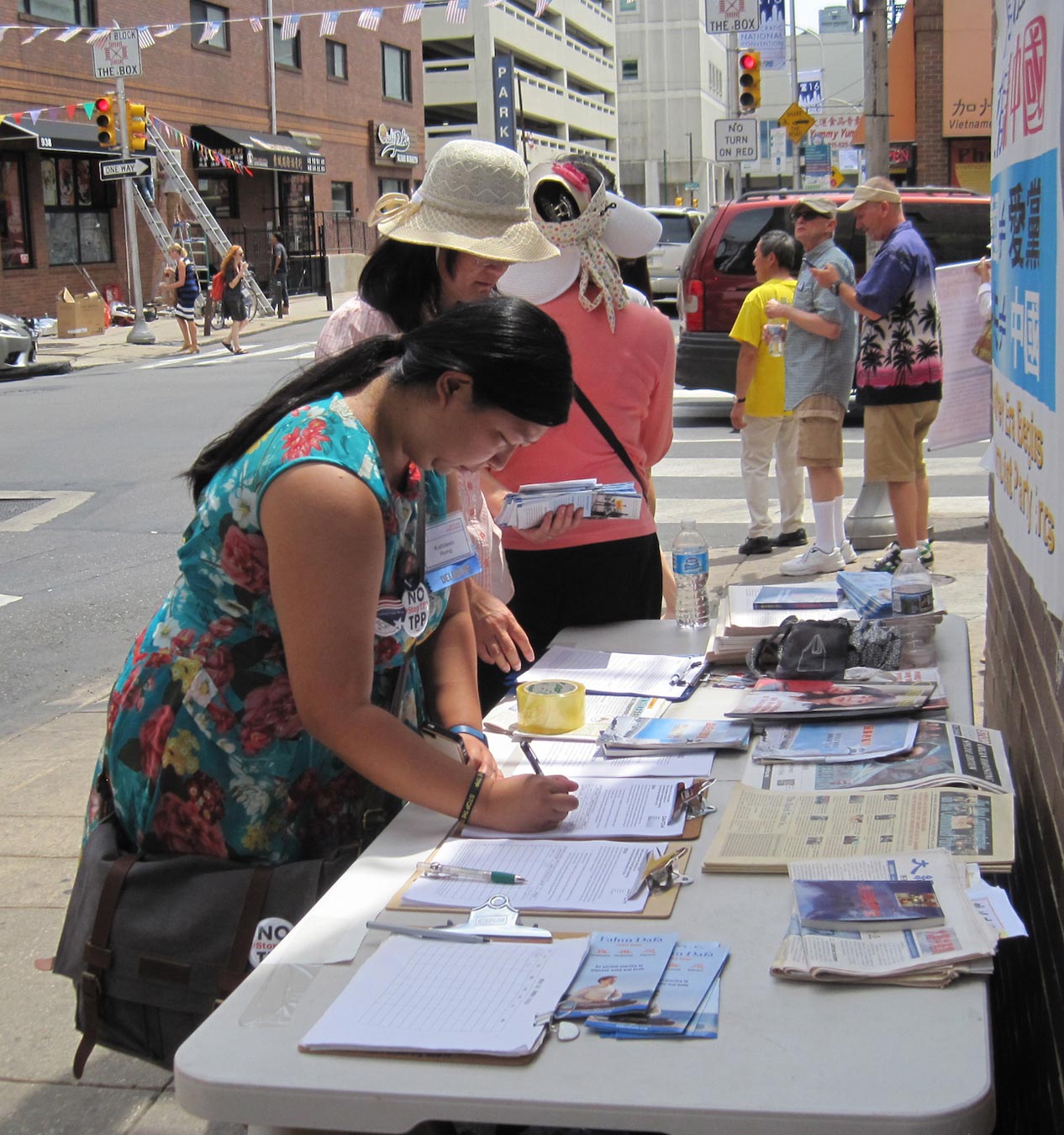 ![]() 图7:许多过往集会现场的费城居民纷纷了解真相,并在“反强制活摘器官”征签表上签名。 |
