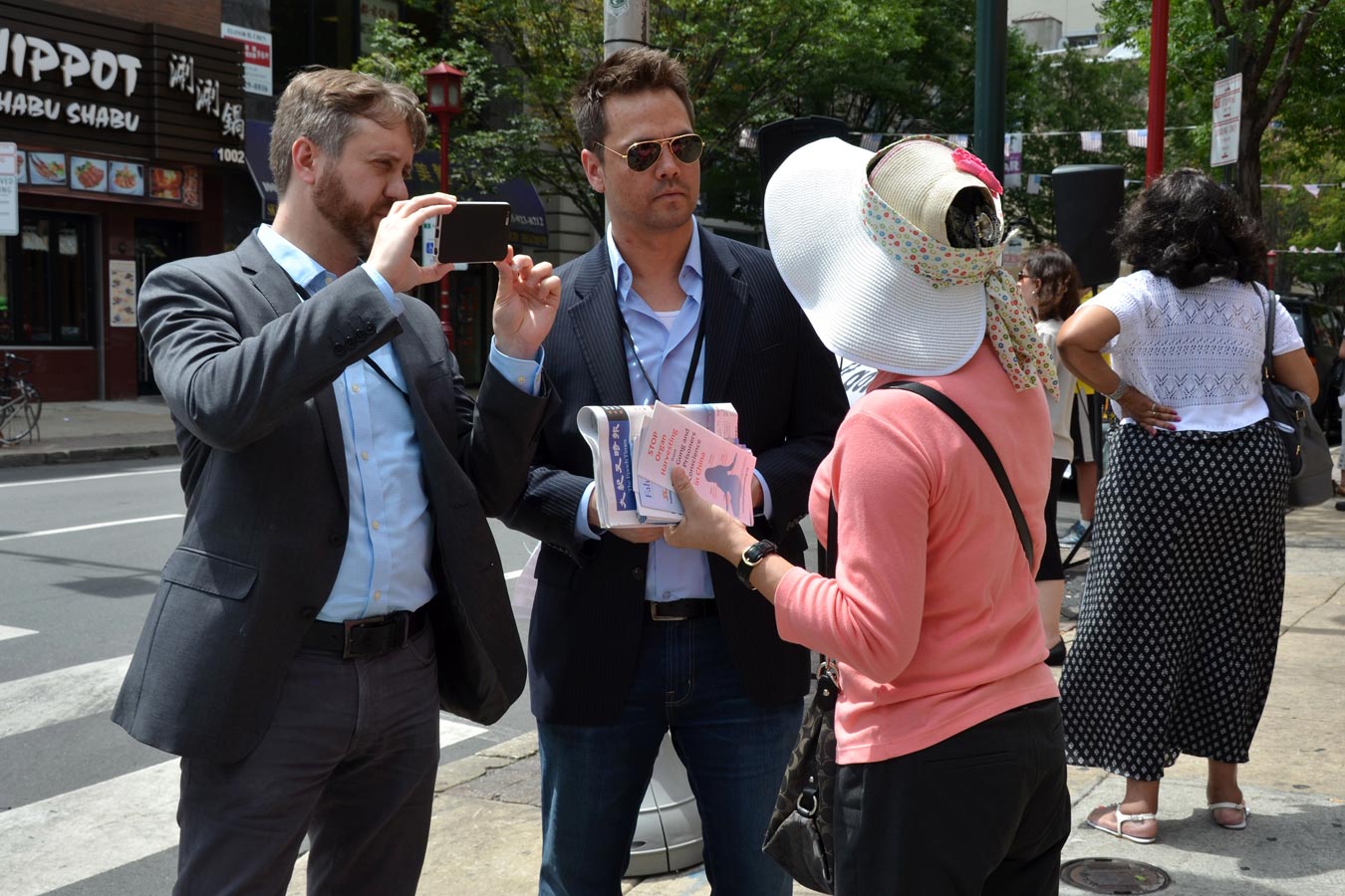 ![]() 图12:费城民众向法轮功学员了解真相。 |
