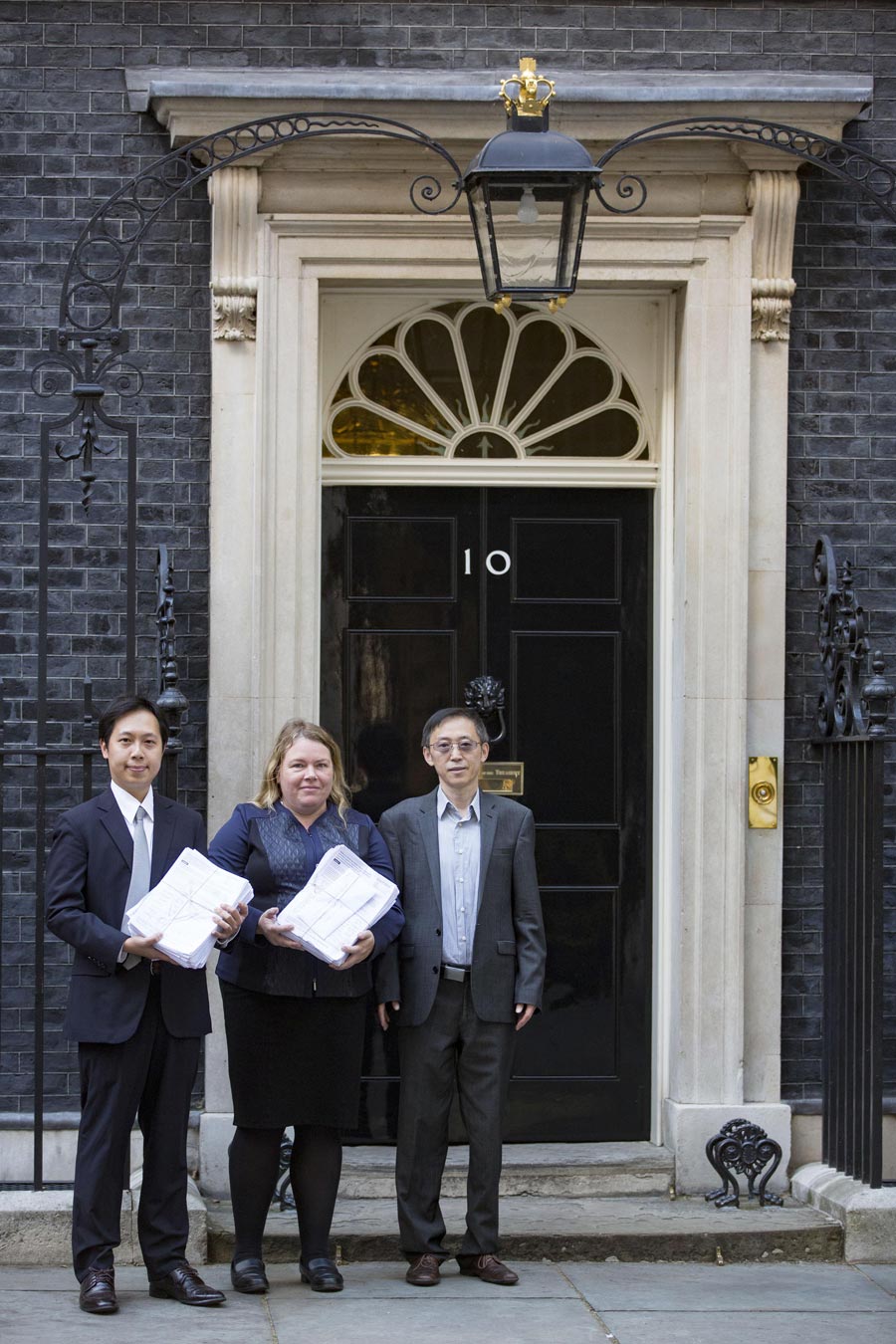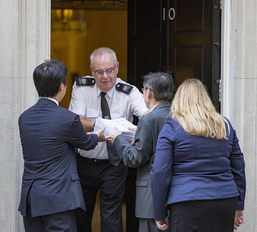 ![]() 图1-2:二零一六年八月二十二日下午,英国法轮大法协会和DAFOH代表在唐宁街10号首相府递交请愿信以及英国民众反中共活摘征签表 |