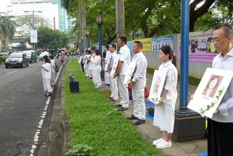 图:雅加达法轮功学员在中使馆前举办和平集会,声援王治文。