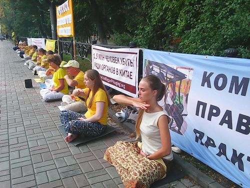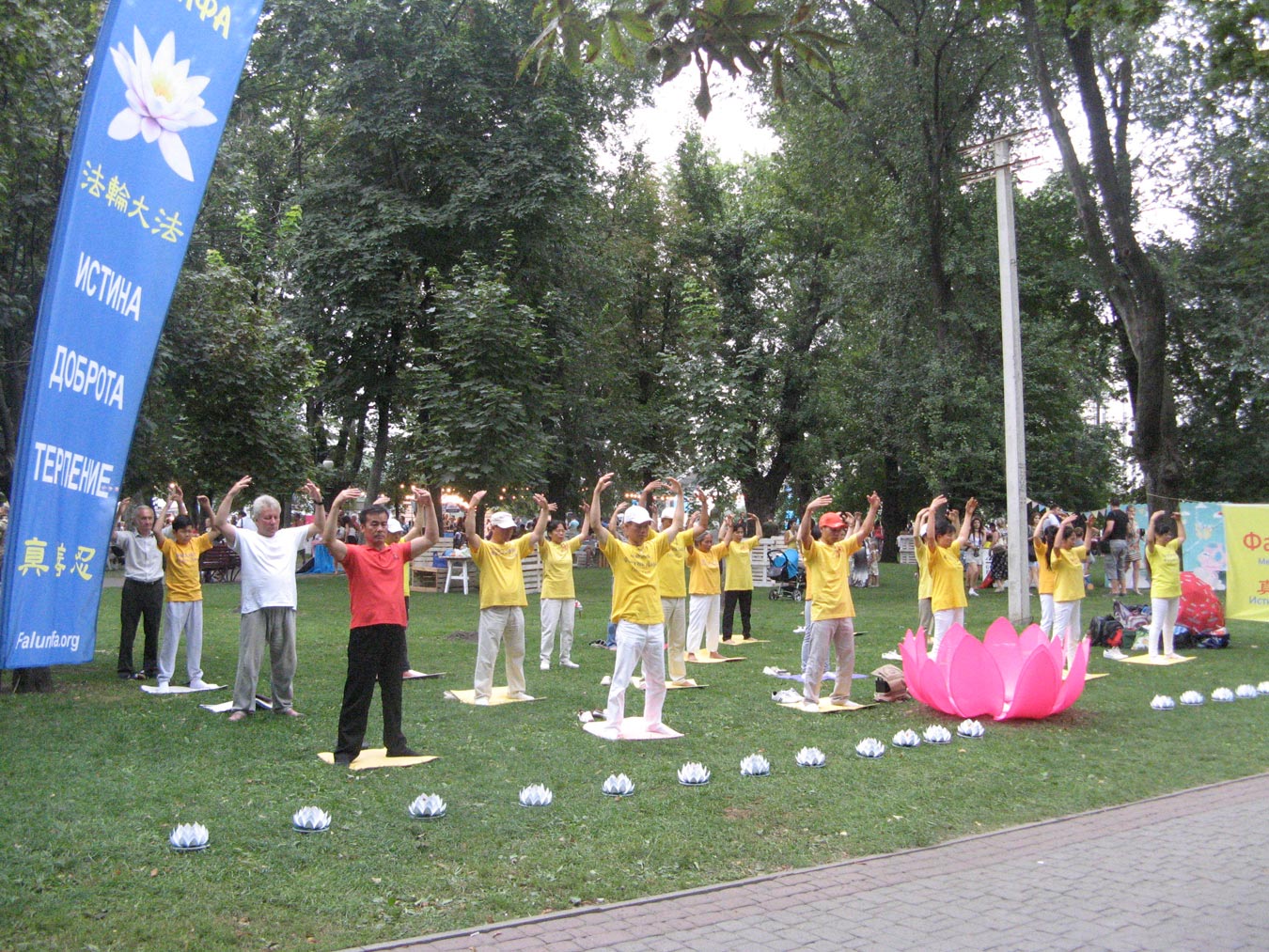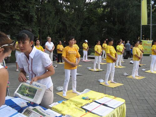 在战事至今持续进行的顿涅茨克区,法轮功学员在独立日当天,在克拉玛托尔斯克市的中心广场举行弘法活动。因为是国家节日,大量的军警都在维护社会秩序。法轮功学员在这里演炼功法,派发真相资料,征集反迫害签名。