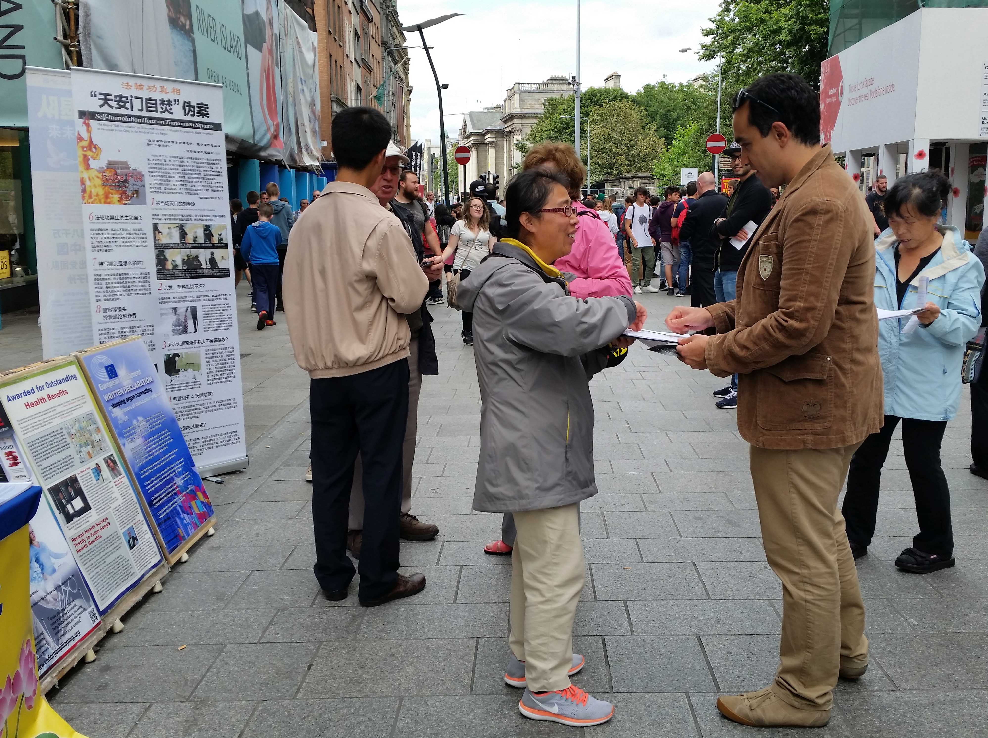 夏季是爱尔兰旅游高峰期,每天都会有成车的中国游客从英国来到爱尔兰,进行回国前最后一次大采购,名品林立的格拉夫顿大街是他们最爱逛的地方。每周六爱尔兰部分法轮功学员会在这里摆上真相展板。