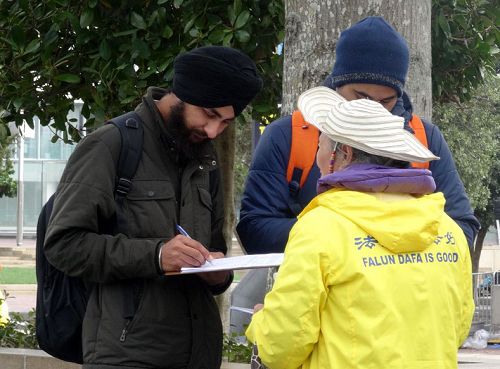 两位中年西人女士路过活动现场,驻足与一位法轮功学员交谈许久,非常认真地听学员介绍真相。她们表示之前没有听说过中共的暴行,都认为“活摘器官”是反人类的。其中一位女士非常有兴趣学炼法轮功,她对同伴说:“这太优美了,我要学炼法轮功”。了解到法轮功的原则是“真、善、忍”教导人做个好人,她们十分认同,表示会去上网了解法轮功著作《转法轮》。