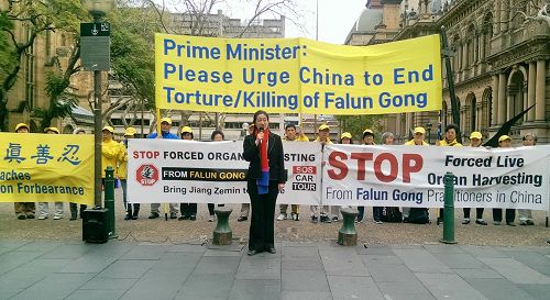 当日清晨,法轮功学员在悉尼市政厅举行了“汽车之旅”启程的新闻发布会,澳洲法轮大法佛学会负责人赵露西博士表示,这是一个澳洲全国性的活动,旨在唤起澳洲各地民众和各级政府关注中国持续十七年、现今仍在发生的对法轮功学员的迫害,特别是近年来国际社会一直在追查的中共活摘法轮功学员器官的罪行。