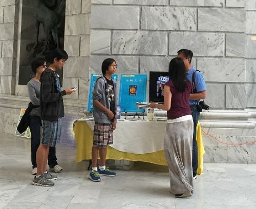 一个中国年轻人带着父母在州政府议会大厦游玩,刚开始他们接了一张明信片就离开到大厦里面去了。不多久,他们又再次出现在真相点,老人在驻足观看学员炼功,那个年轻人就对老人说,“您不是想了解真相吗?我们多拿一些资料回去。”说着,他自己主动到真相资料台上每种资料都拿了一份交给老人。