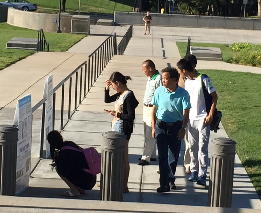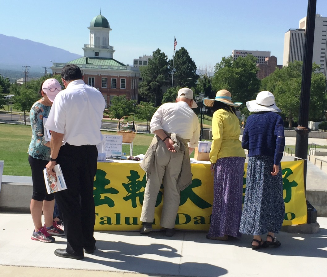 ![]() 图6:华人游客到犹他州议会大厦门口的法轮功真相展位取资料 |