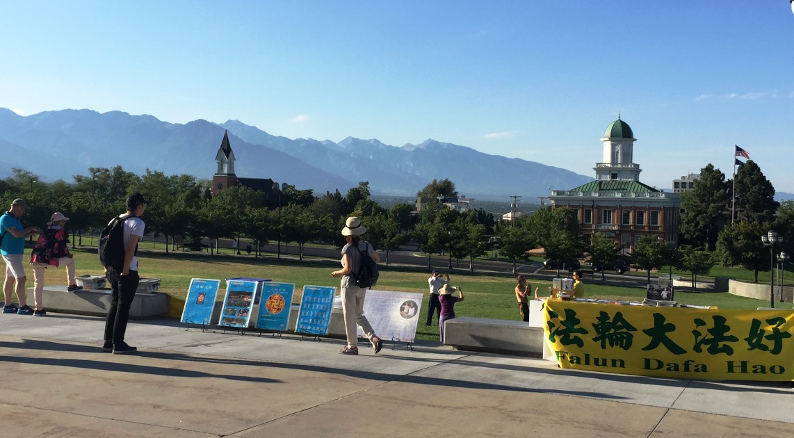 法轮功学员在这里设立的真相点,包括资料台,各种展板,播放真相视频的电视,录音,学员也在此炼功。还有精美的犹他州和附近风景点的明信片,免费提供给游客。