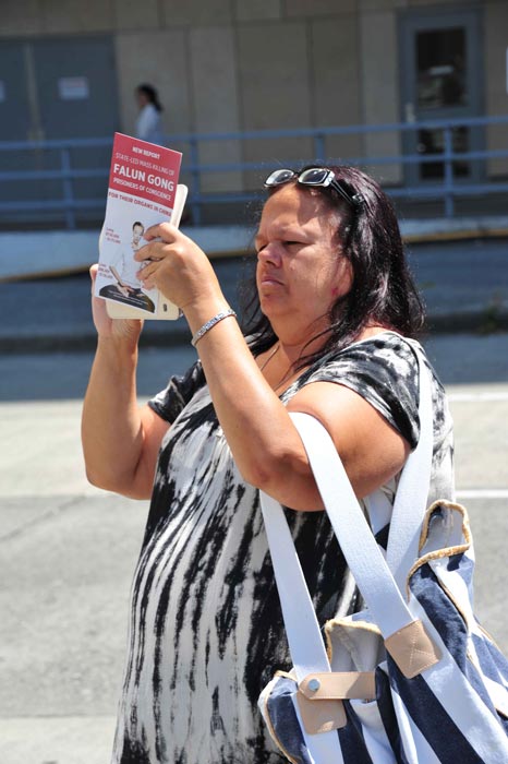 Kirstin Lanong女士用手机拍摄了做真人酷刑演示的法轮功学员,她双手合十,面对在做真人模拟酷刑演示的法轮功学员,虔诚地鞠躬,再鞠躬。