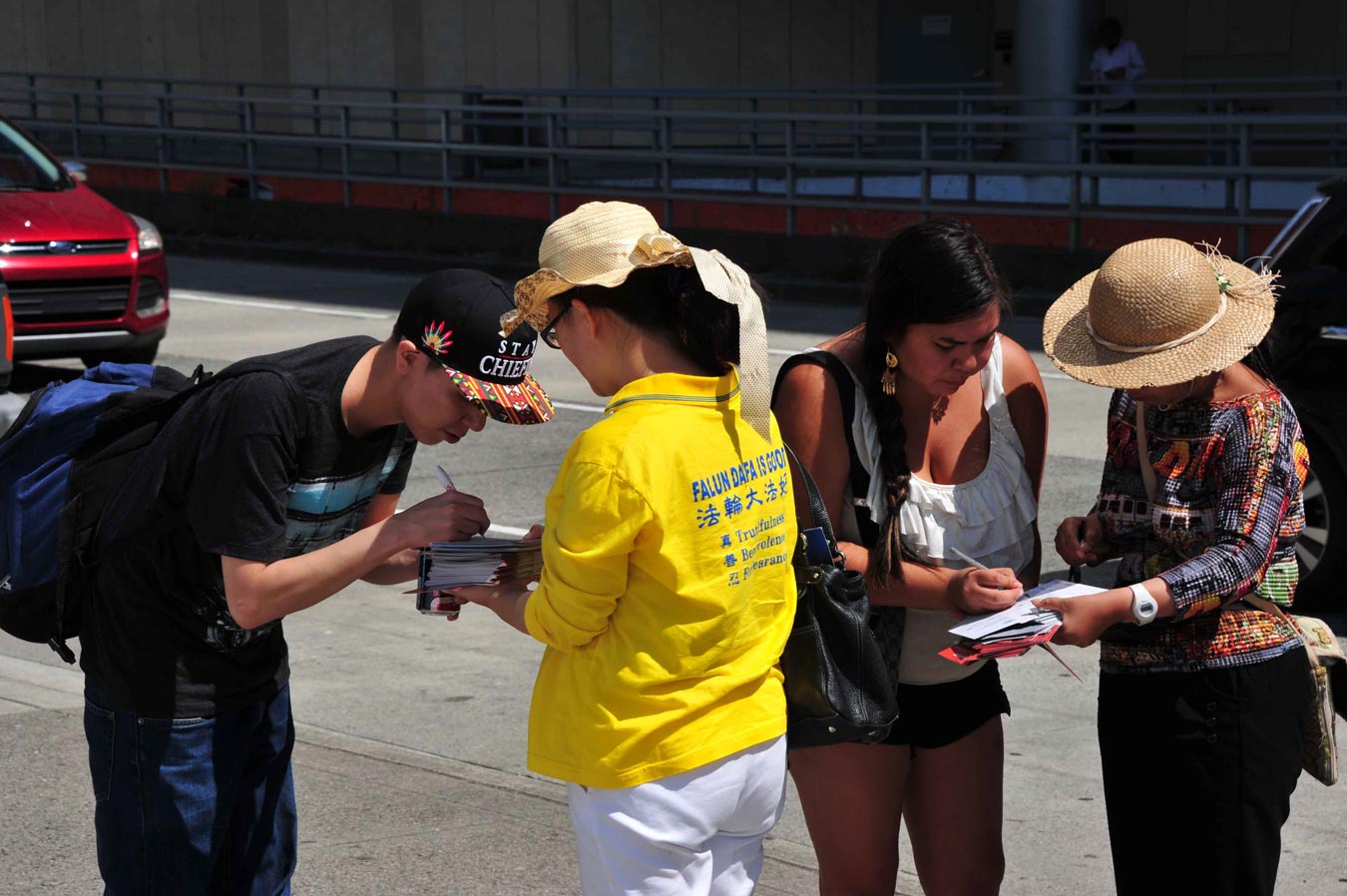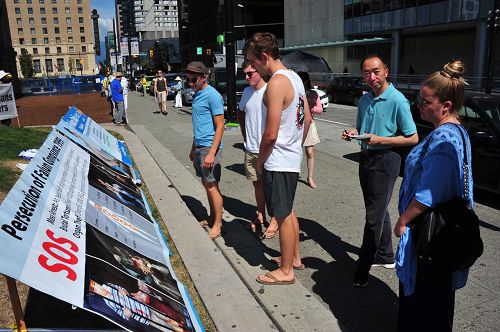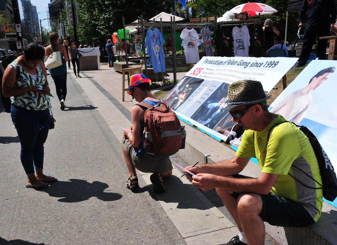 ![]() 图1-9:二零一六年八月一日中午,在加拿大温哥华部份法轮功学员在温哥华市中心举行反迫害活动,吸引过路民众纷纷停留关注并签名支持。 |