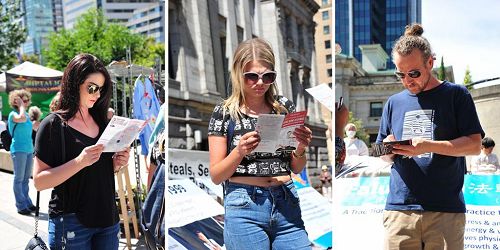 当天中午,法轮功学员在温哥华市中心举行反迫害活动,包括真人演示反酷刑展,真相长城等,向民众揭示中共对法轮功的迫害仍在继续,同时向各界民众征集签名,呼吁加拿大总理特鲁多在八月访问中国大陆时明确提出停止迫害法轮功,结束这场反人类的罪恶,活动吸引大批民众停留,很多民众签名和留言表示支持法轮功学员反迫害。
