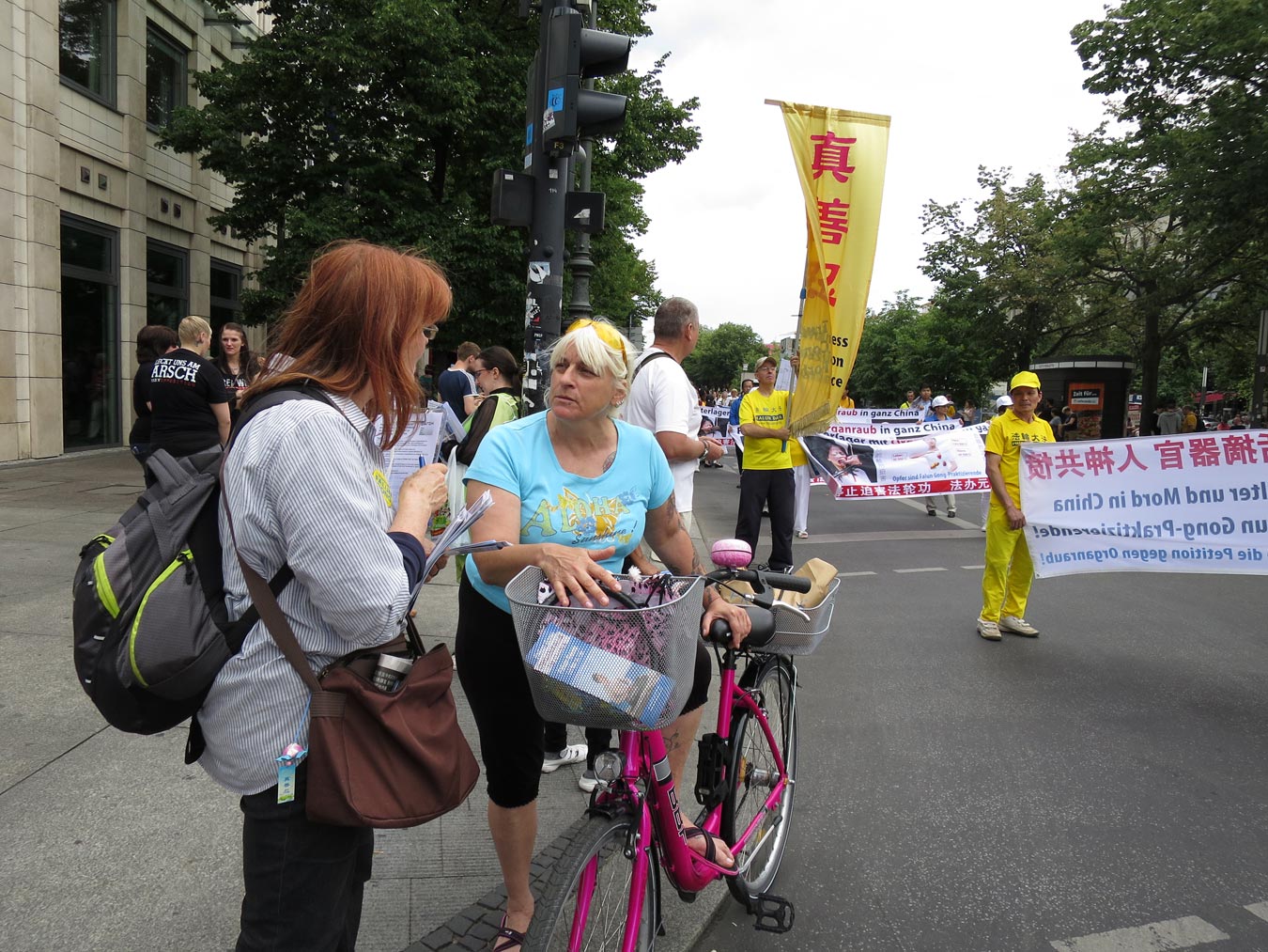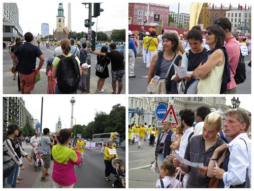 中午时分,当游行队伍在中领馆前Jannowitzbrücke大桥集会时,不少过路的民众被八十人的天国乐团的演奏以及法轮功学员的演讲所吸引,他们停下脚步聆听。