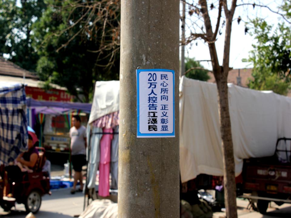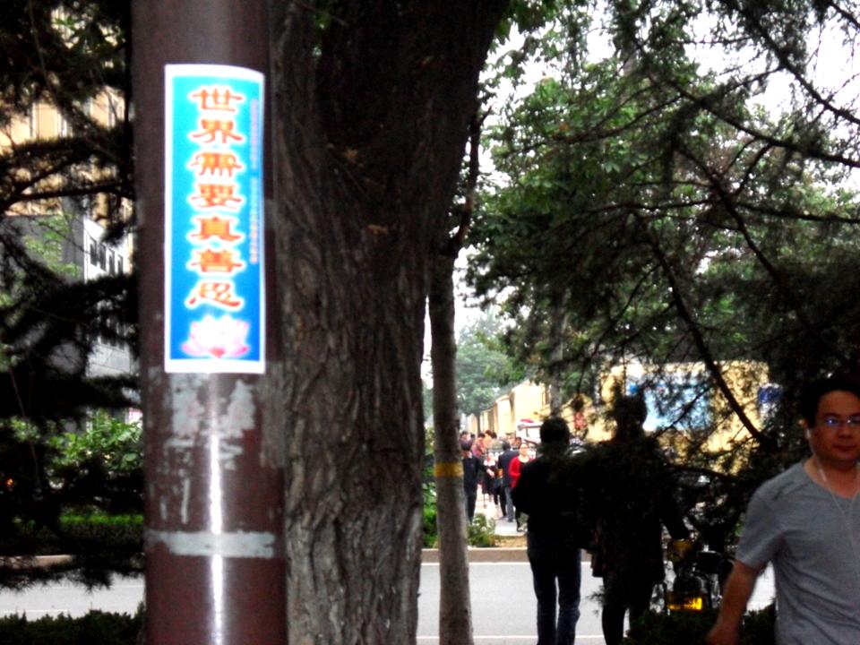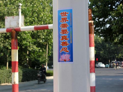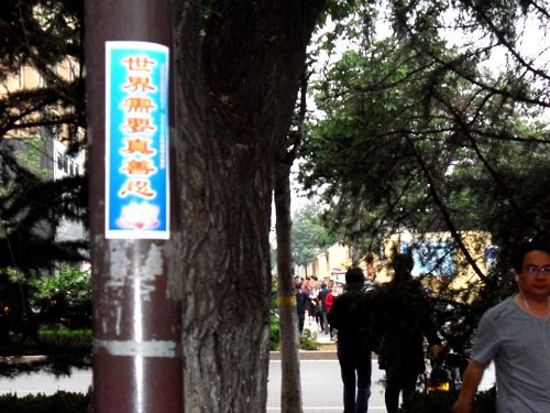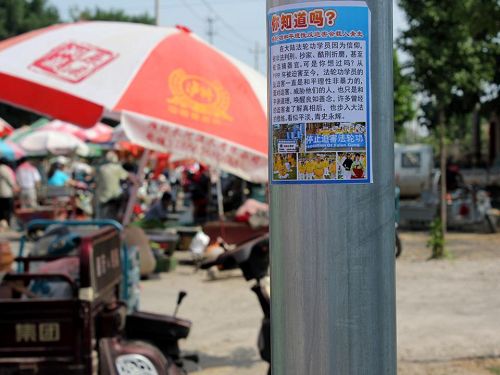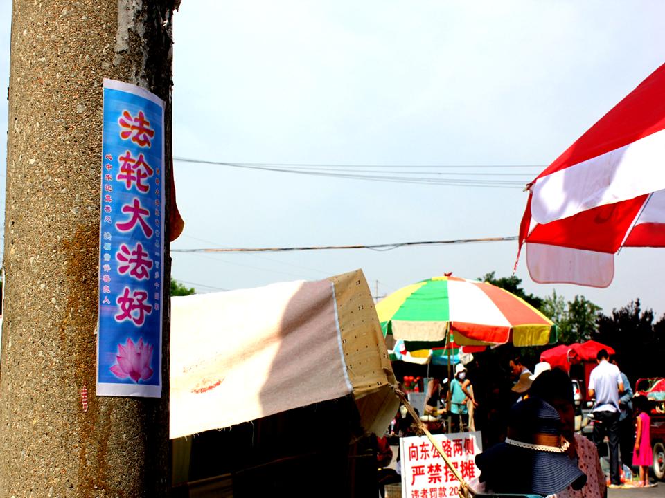 环顾四周,法轮大法的真相粘贴在大集上随处可见。有些年轻人和外地过路游客,举起手机将这些传单和粘贴作为历史的见证拍摄下来。
