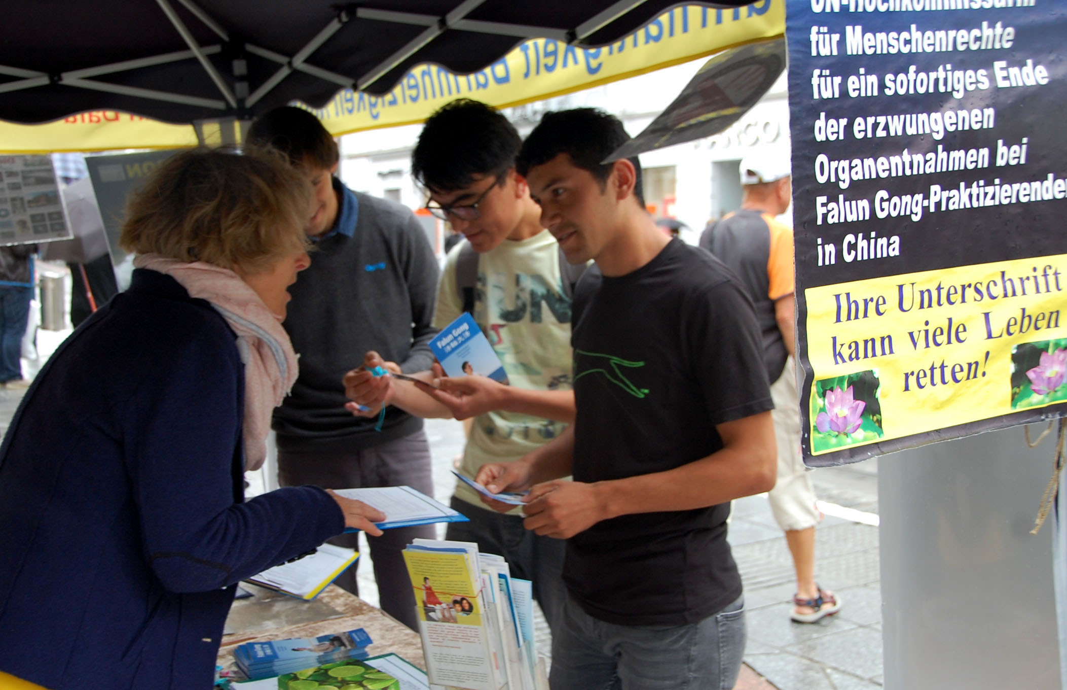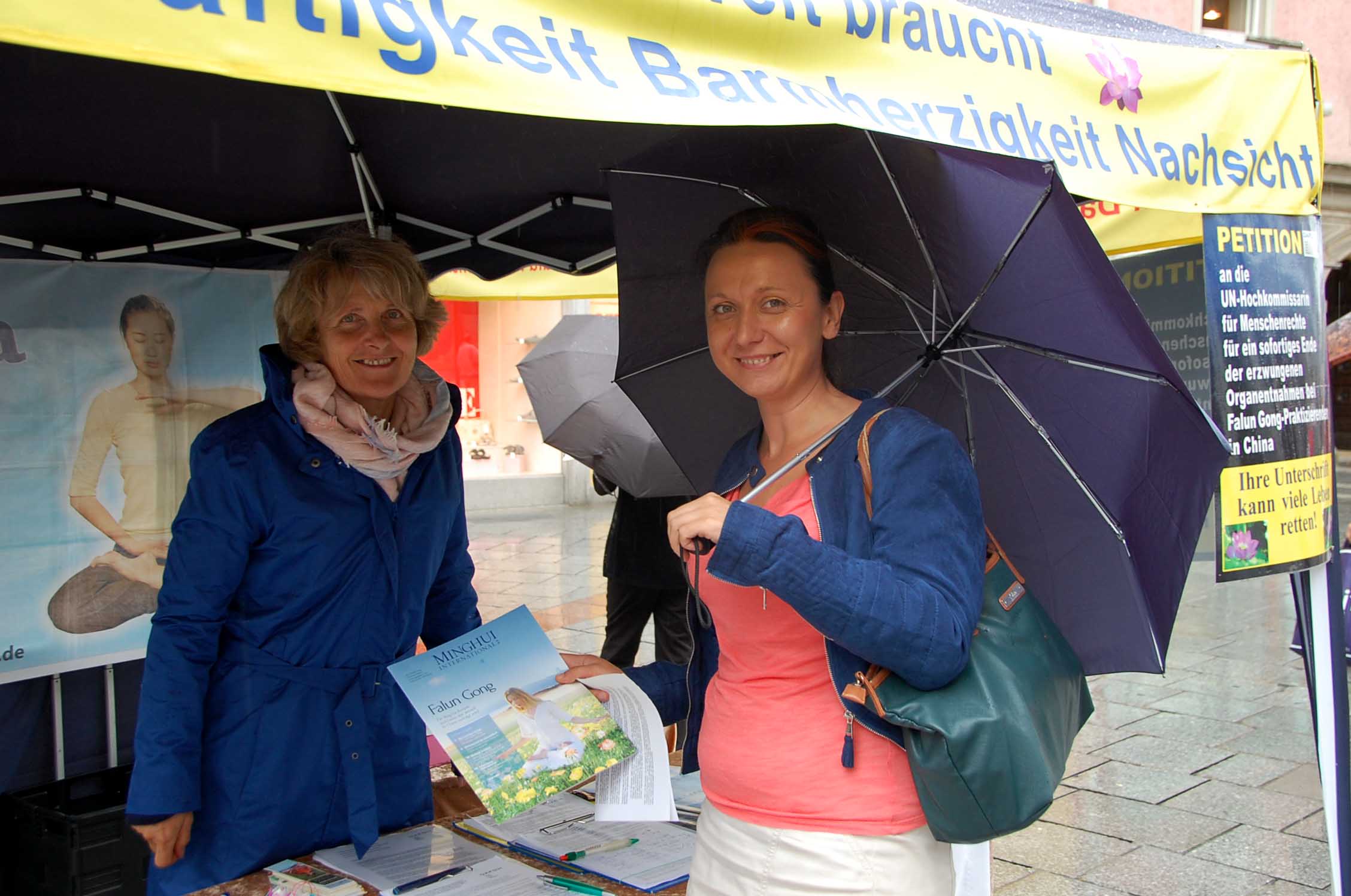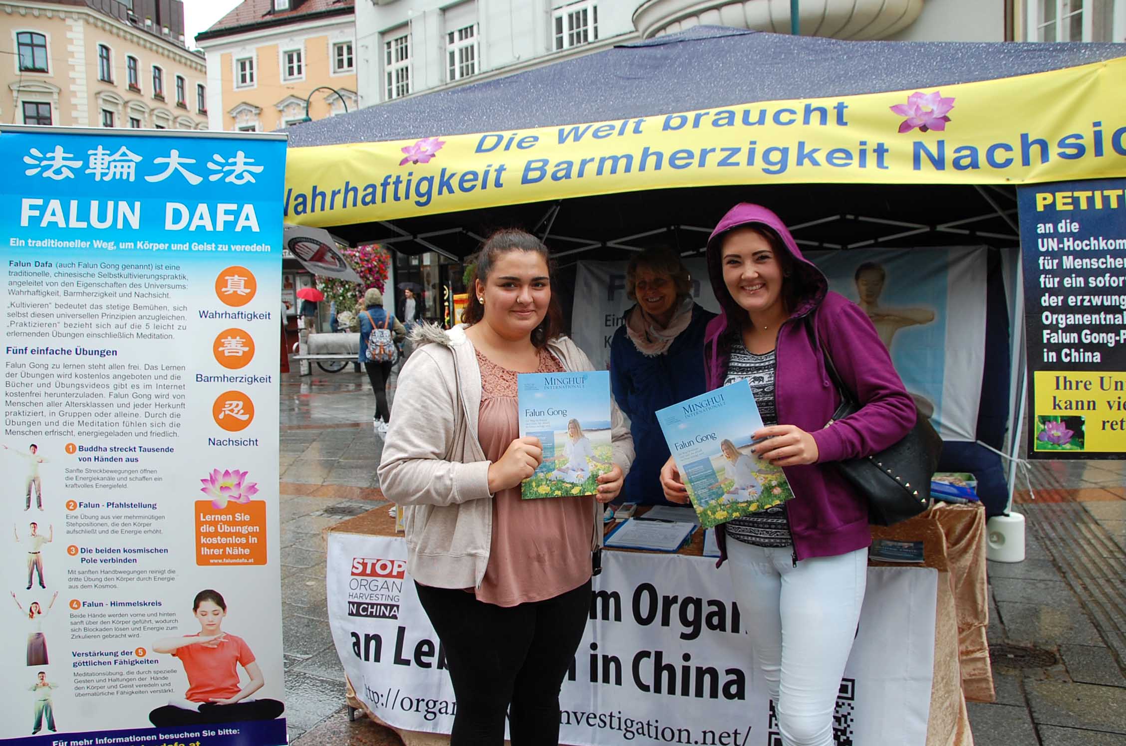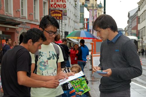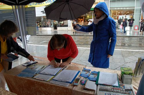 法轮功学员在位于林茨最繁忙的商业购物街Landstrasse设立信息展位。尽管当天下起了雨,但是很多过往民众在知道真相后,来到信息台前在制止活摘法轮功学员器官的征签表上签名。也有人询问关于炼功点的情况,想要学炼法轮功。