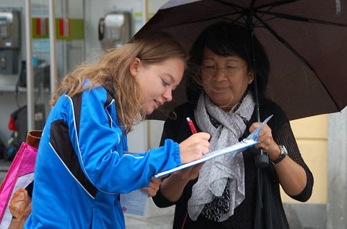 奥地利女孩Julia和她的女朋友Econila径直来到信息台前签名。Julia说她和母亲都知道了中共迫害法轮功的真相。她和朋友正好路过,也过来签字,她们都认为这场迫害太残酷,必须制止。
