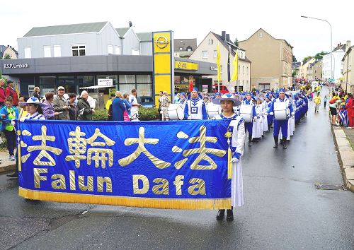 沿途的节日主持人惊喜的向观众介绍着这个与众不同的天国乐团。当乐团经过主席台时,州长提里希夫(Stanislaw Tillich)及主席台上观众报以热烈掌声欢迎天国乐团来参加萨克森日。法轮功学员递给他们传单。萨克森州长在去年萨克森日游行中也看到了欧洲天国乐团的表演,萨克森日过去很长时间了,州长还在不同的正式场合津津乐道着欧洲天国乐团、仙女队及功法演示的美好。