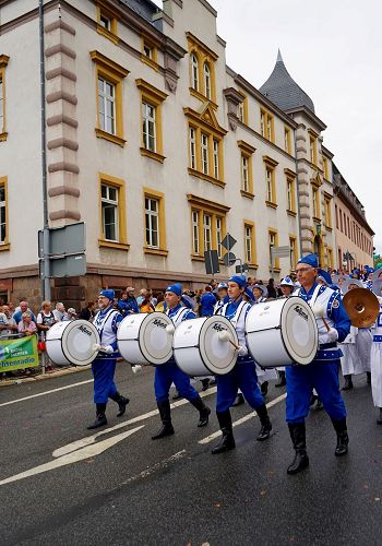 身穿唐代服装的欧洲天国乐团一路演奏了《法轮大法好》、《送宝》和在德国脍炙人口的《英雄颂》等乐曲,伴随着沿途观众不断的掌声走完全程。这支来自德国、法国、英国、捷克等欧洲十个国家的一百三十位法轮功学员组成的乐团,利用业余时间,用军乐的形式展现法轮功的美好。参加萨克森日是他们今年暑假的东欧、奥地利和德国之旅的最后一站。