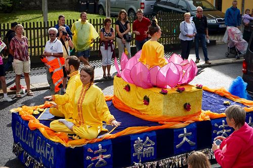 在九月四日的庆典游行中,共有一百七十多个团体参加。由欧洲天国乐团、仙女队和功法演示花车组成的法轮功学员游行队伍非常醒目,所到之处,不断有成群结队的观众为他们叫好和鼓掌,人们非常乐意接受法轮功学员派发的真相资料。