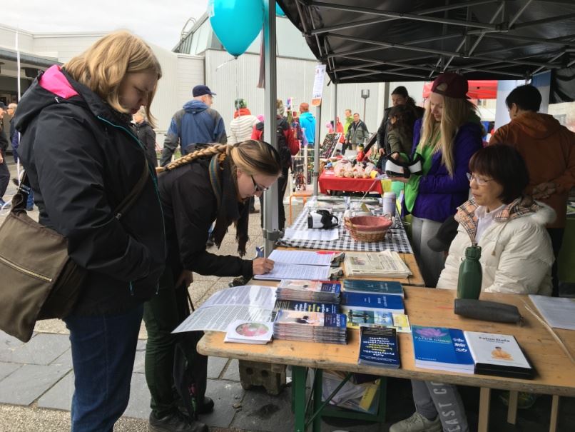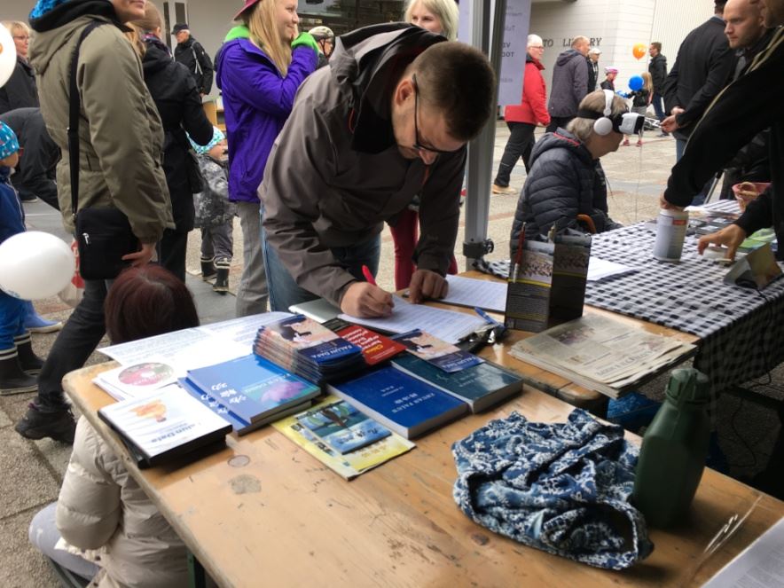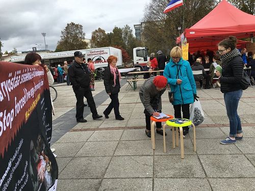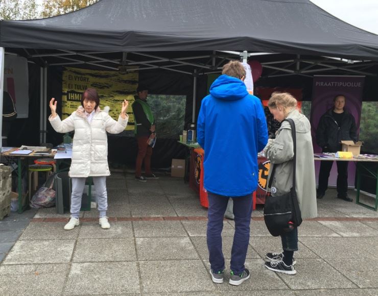 早上九点居住在罗瓦涅米的两位法轮功学员在市中心讲真相,并征集签名制止中共对法轮功的迫害,学员以演示法轮功的五套功法、真相横幅、发放真相资料等形式,向当地民众介绍发生在中国大陆的中共活体盗取法轮功学员器官的罪行。