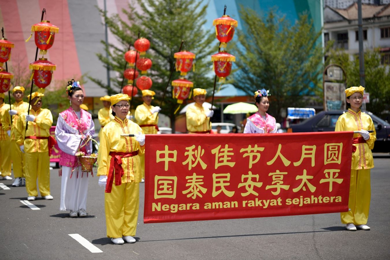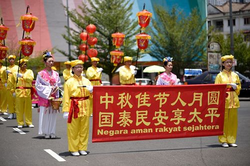 当天的首场庆中秋游行活动,在天国乐团的演奏声中,在雪兰莪州班丹英达 (Pandan Indah)繁华城镇拉开序幕。紧接在后的有灯笼队、仙女队、舞龙队、以及腰鼓队,一路上把民众带入了喜庆的氛围中。压轴登场的还有祥和的法轮功学员示范炼功的队伍。活动过程中,交通警察和自愿警卫队也前来提供协助,为法轮功游行队伍开路。不仅是华人,各族民众也纷纷以喜悦的心情,欢迎法轮功庆中秋游行队伍的到来。